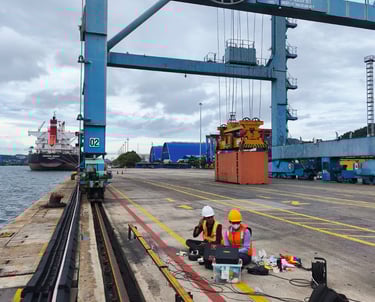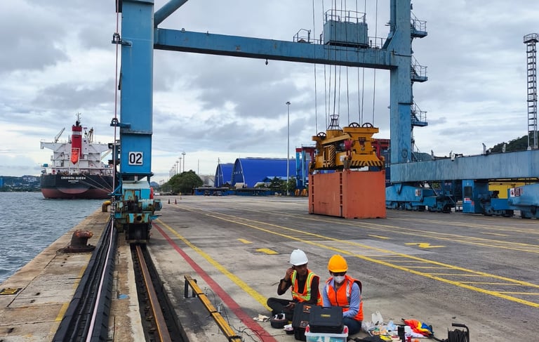 Full Scale Loading pada Balok Crane dengan beban berjalan dari berat Crane sendiri dan juga beban angkut crane dilaksanakan pada Dermaga E ini untuk mengetahui kondisi eksisting baik defleksi, regangan dan juga getaran dinamis pada balok crane utama.